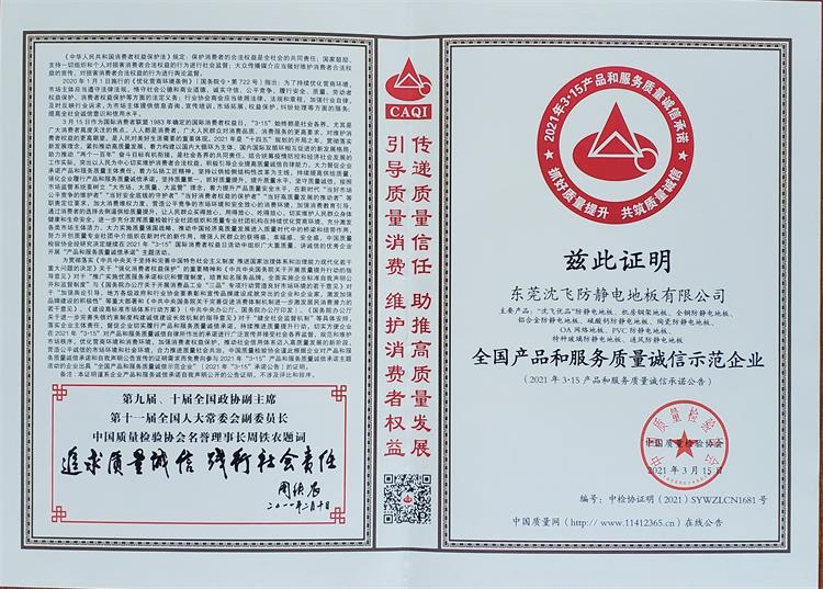 沈飞防静电地板获得全国产品和服务质量诚信示范企业称号