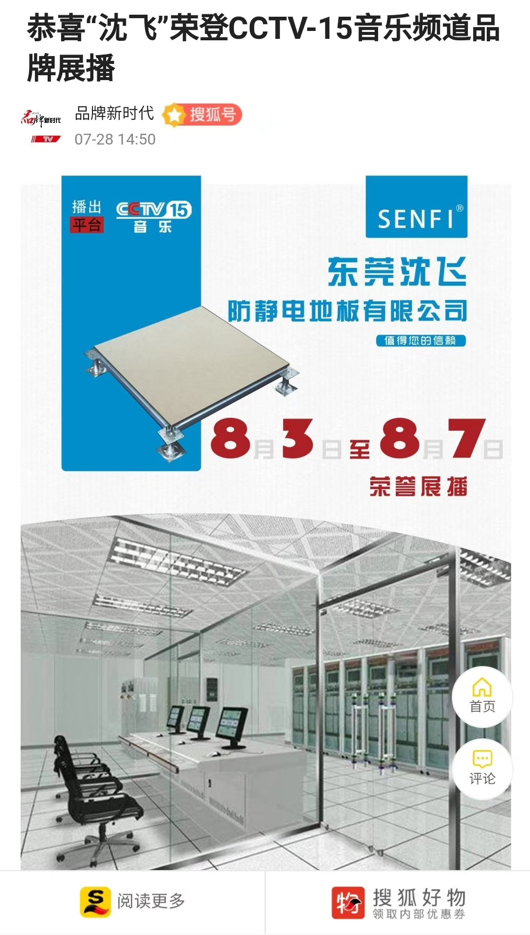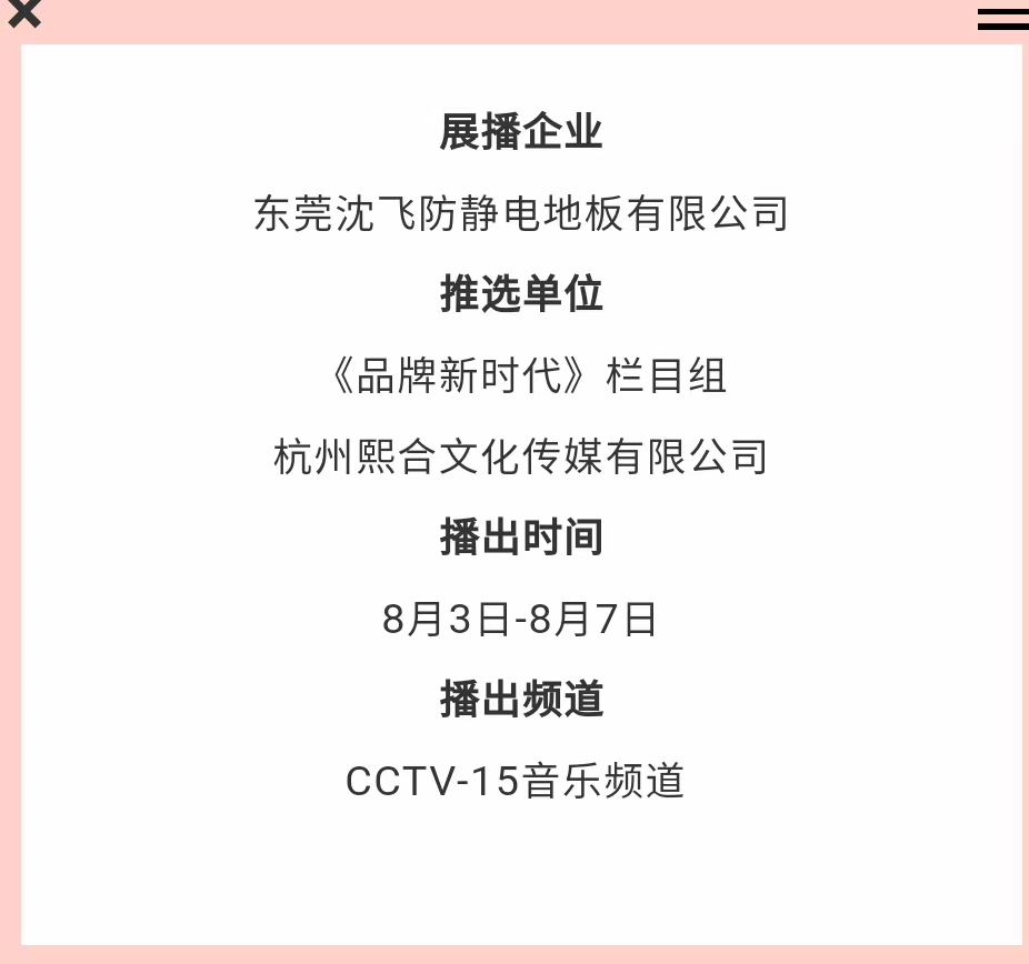 热烈祝贺我旗下企业-东莞沈飞防静电地板有限公司,经过多次实地走访考察,多方数据整合汇总,“沈飞优品”不负众望,成功通过了层层严格审核,荣登央视CCTV-15音乐频道品牌展播!CCTV15 23:42 8月3号至8月7号播出,敬请留意收看。