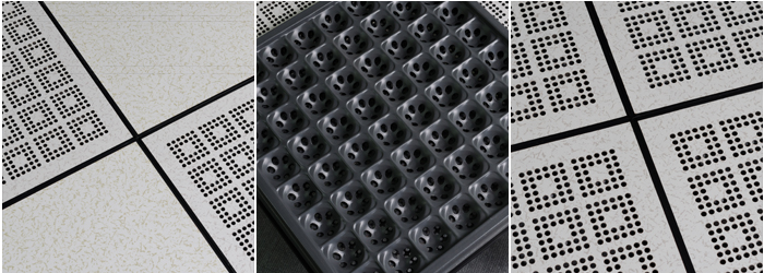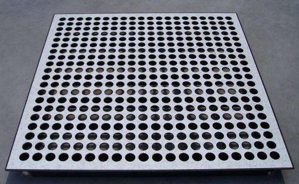 全钢防静电通风地板正、底面结构组成与防静电全钢活动地板类似,上表面粘贴高耐磨麻面防静电三聚氢胺贴面(HPL)或PVC贴面,四周镶嵌导电边条。但内腔是空的,无发泡水泥填充,地板的上下钢板和上表面贴面均冲制有通风孔。通风活动地板与全钢通路活动地板配套使用,用于地板下部有通风要求的场所,地板通风率为17%—36%。