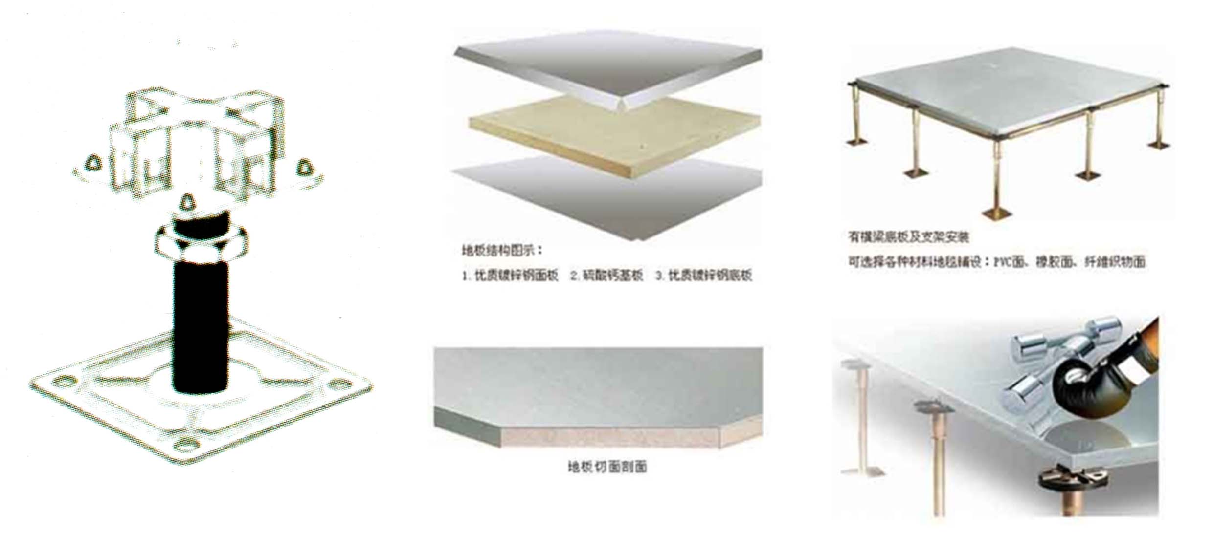 序制作而成、整体强度高、载重力强、耐高温、耐燃烧、支架的结构适用于不同种类的地板,