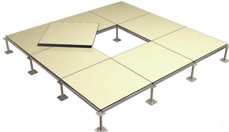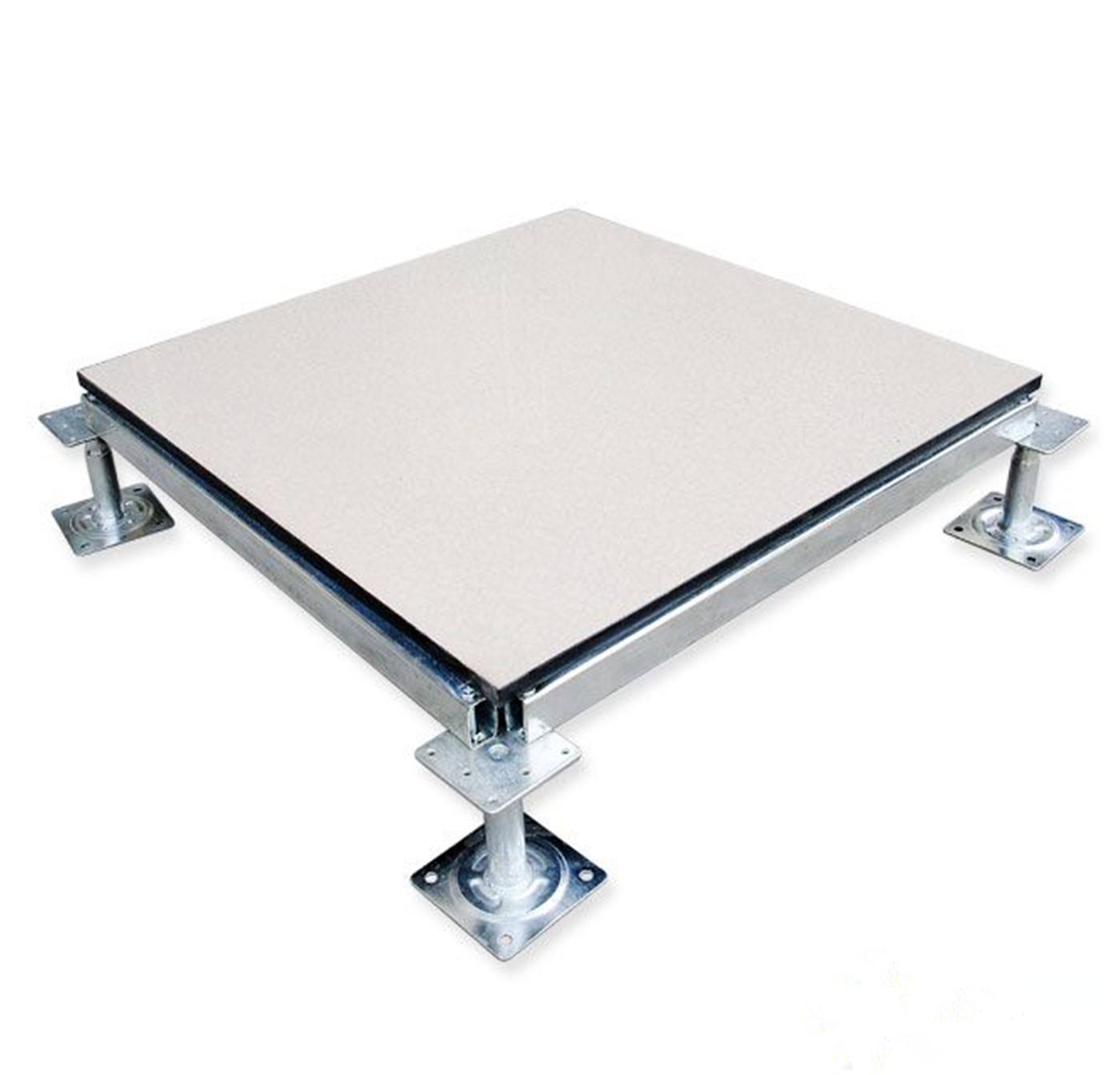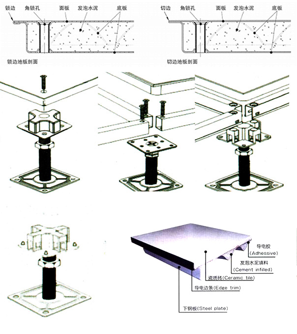 全钢陶瓷防静电地板系统由地板、横梁、支架组成。横梁和自身高度可调的支座用螺钉连结成稳固的下部支承系统,地板镶嵌入横梁围成的方格内。