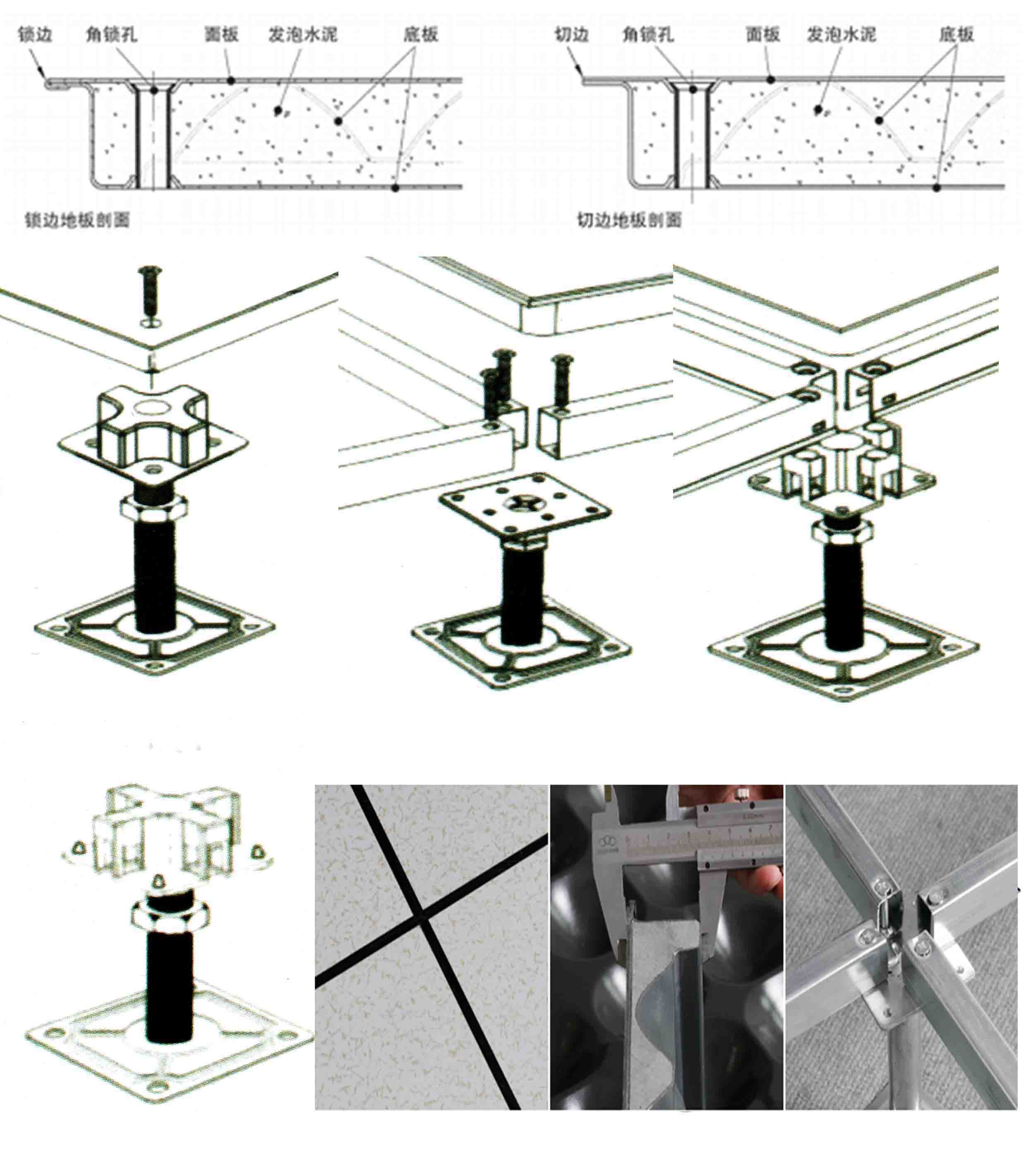 1.支架为镀锌或铸铝合金结构,高度可调节并能自锁,地板四周成型有切边与铆接两种,由于智能化楼宇配线复杂,功能齐全,故出线借口繁多,全钢防静电地板配有模压开孔型,安装采用角锁孔连接固定,具有牢靠、稳定、调平简便之特点。